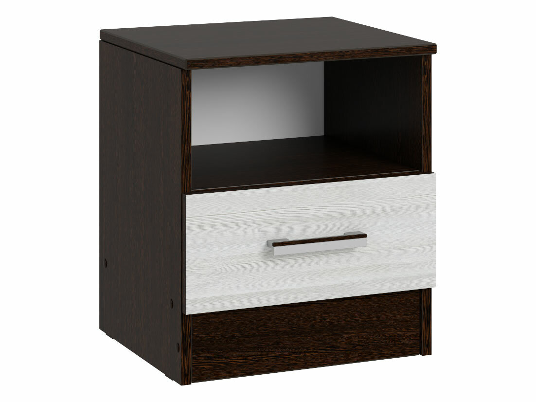 Компактная напольная прикроватная тумба с открытой полкой и выкатным ящиком на роликовых направляющих. Не займет много места и добавит функциональности мебельному гарнитуру в спальне.